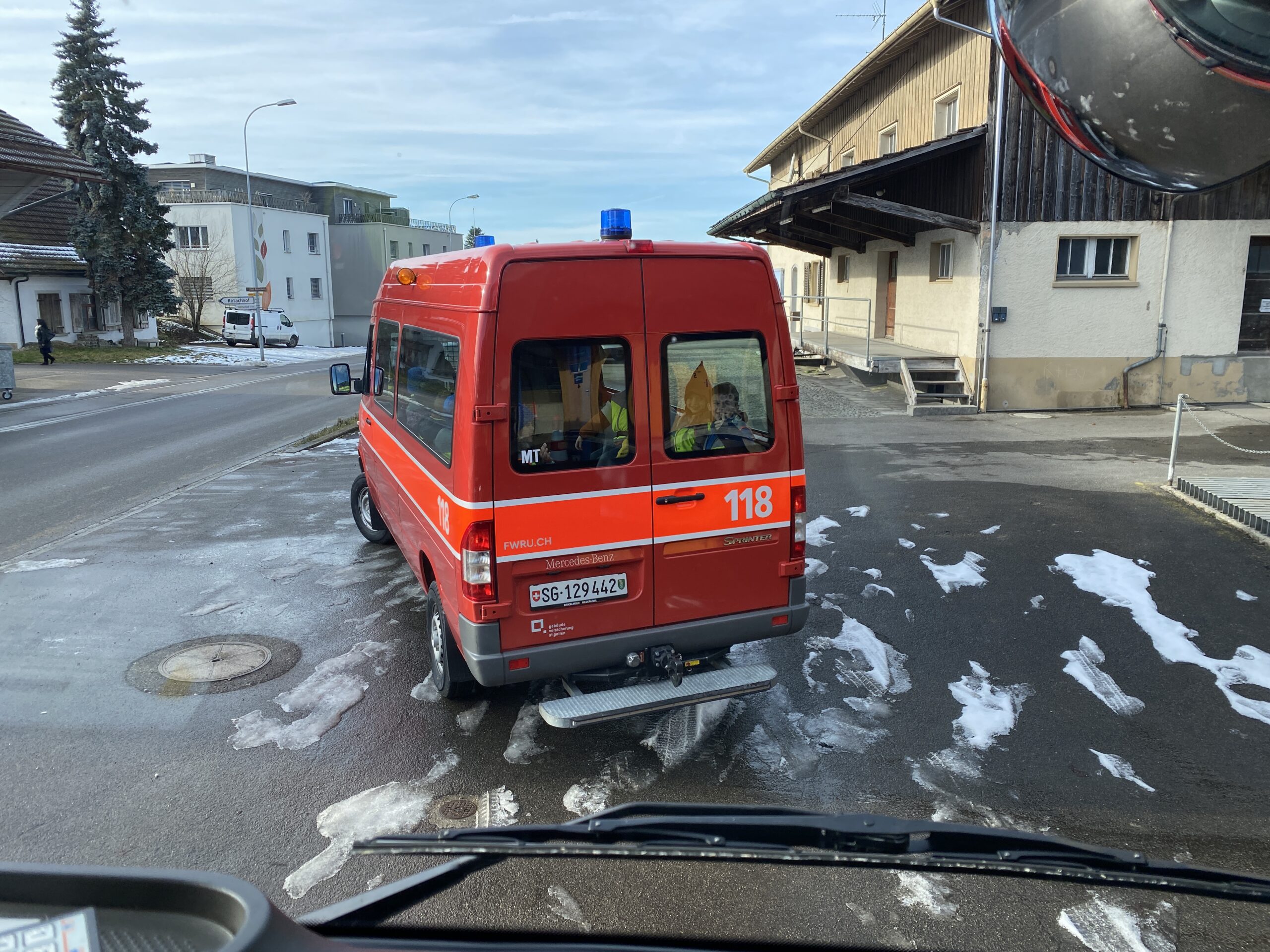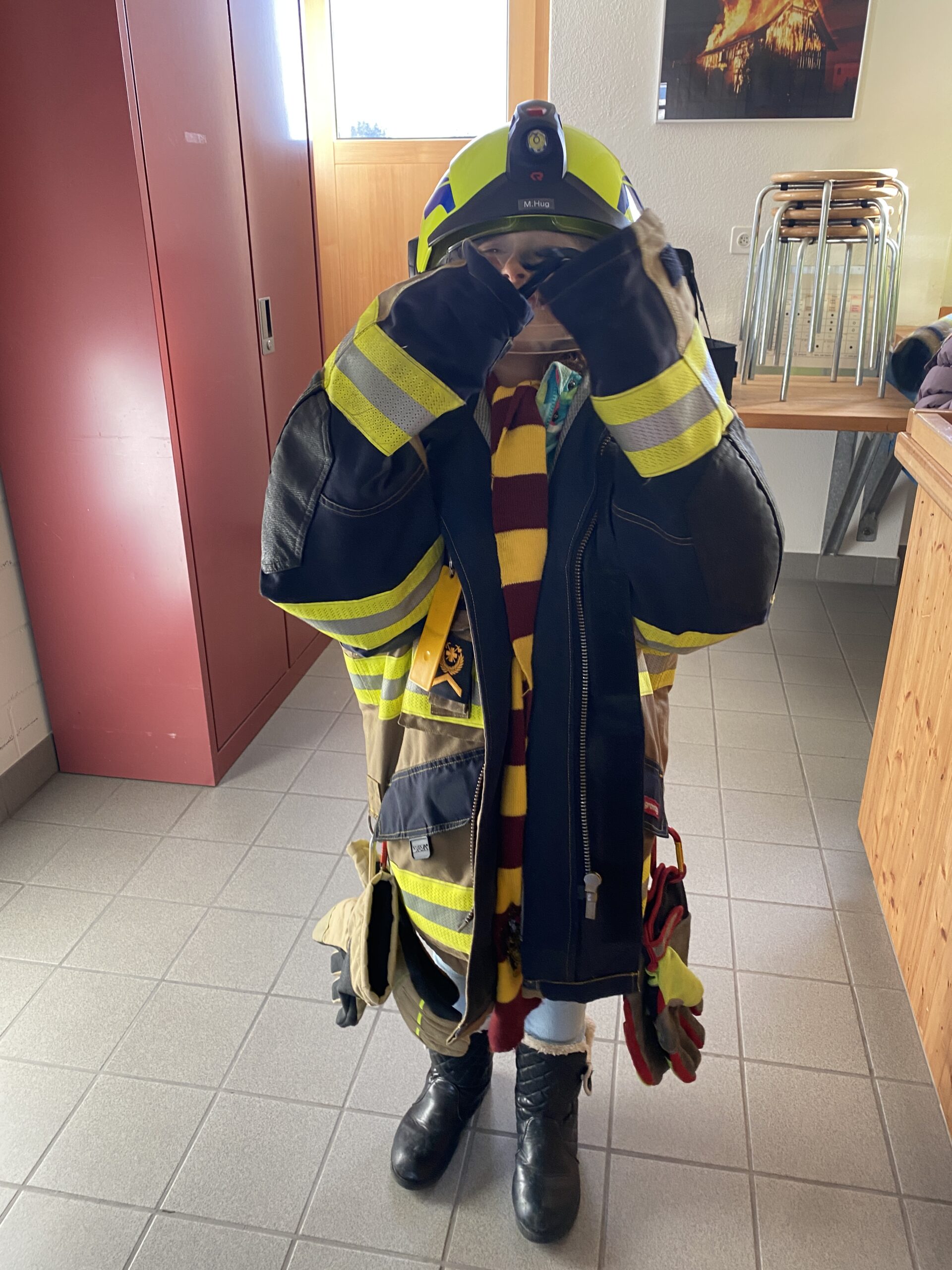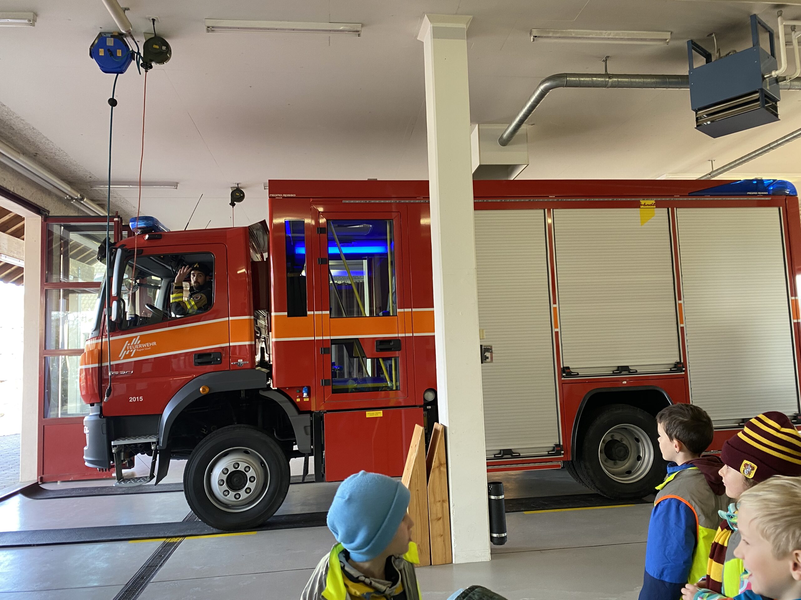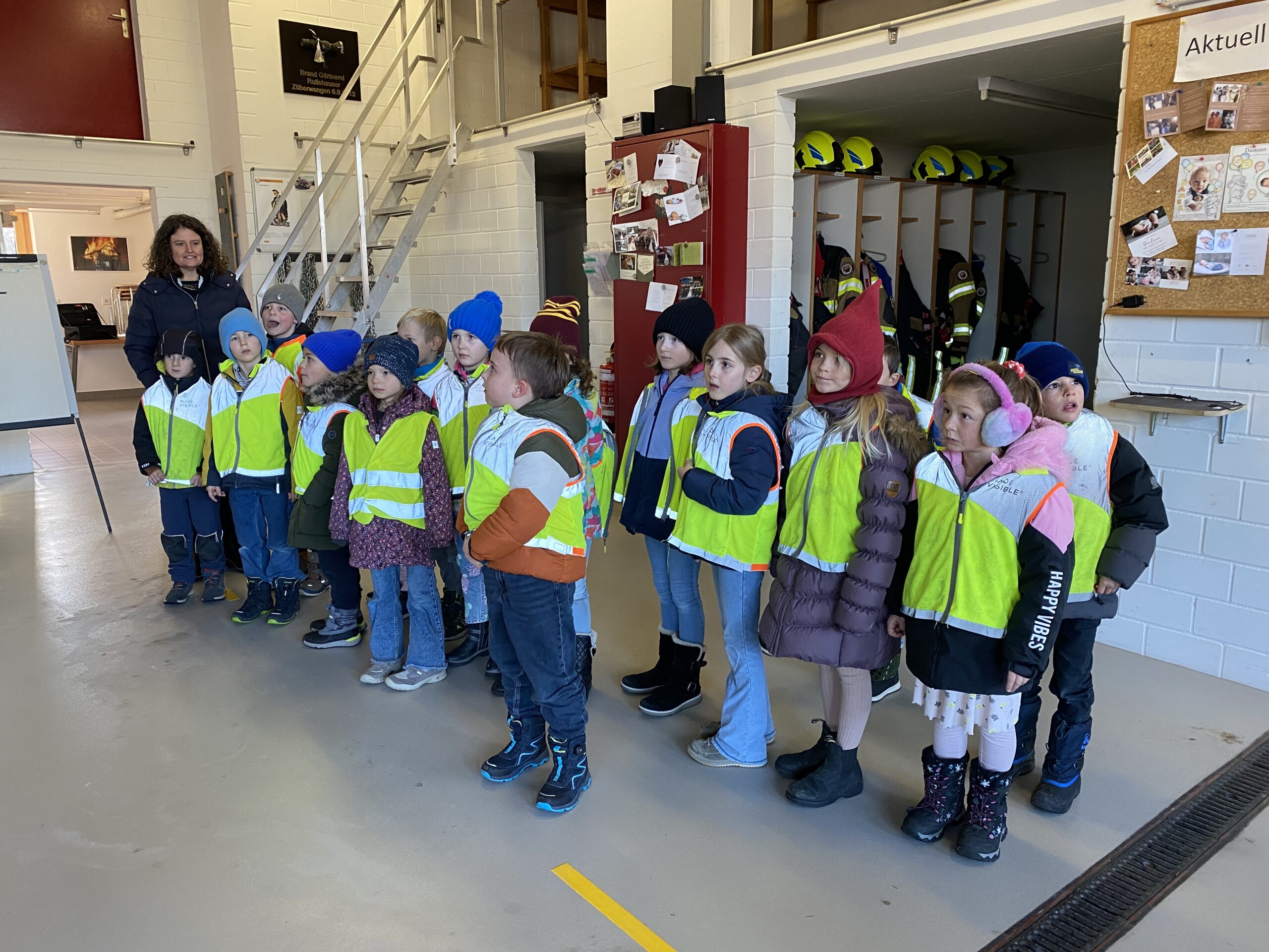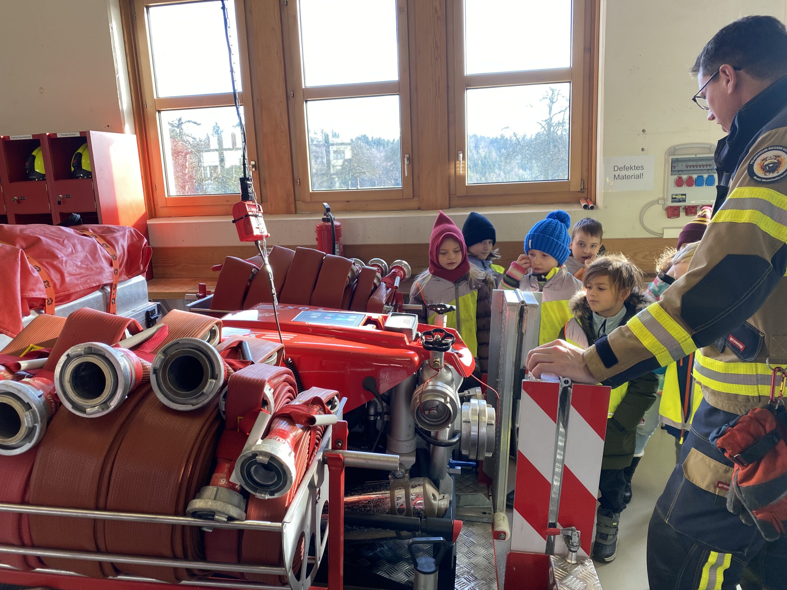 Die erste und zweite Klasse besuchte am Freitag, 16.1.2026, die Feuerwehr in Niederhelfenschwil. Lars Kappeler und Thomas Jung erklärten den Kindern und den Lehrpersonen mit ansteckender Begeisterung und grossem Fachwissen das Innenleben eines Tanklöschfahrzeugs. Es war sehr spannend und auch überraschend, was in einem solchen Fahrzeug alles aufbewahrt wird. Die Kinder konnten auch einmal in die Ausrüstung eines Feuerwehrmannes schlüpfen und sich wie ein Feuerwehrmann oder eine Feuerwehrfrau fühlen. Danach durften alle Kinder mal mit einem Feuerwehrschlauch Wasser spritzen, was gar nicht so einfach war. Denn der Druck, mit welchem das Wasser zum Schlauch rauskam, war enorm. Da sah man viele strahlende Kindergesichter und für einige der Schüler*innen war klar: auch sie würden später, wenn sie erwachsen wären, der Feuerwehr beitreten.