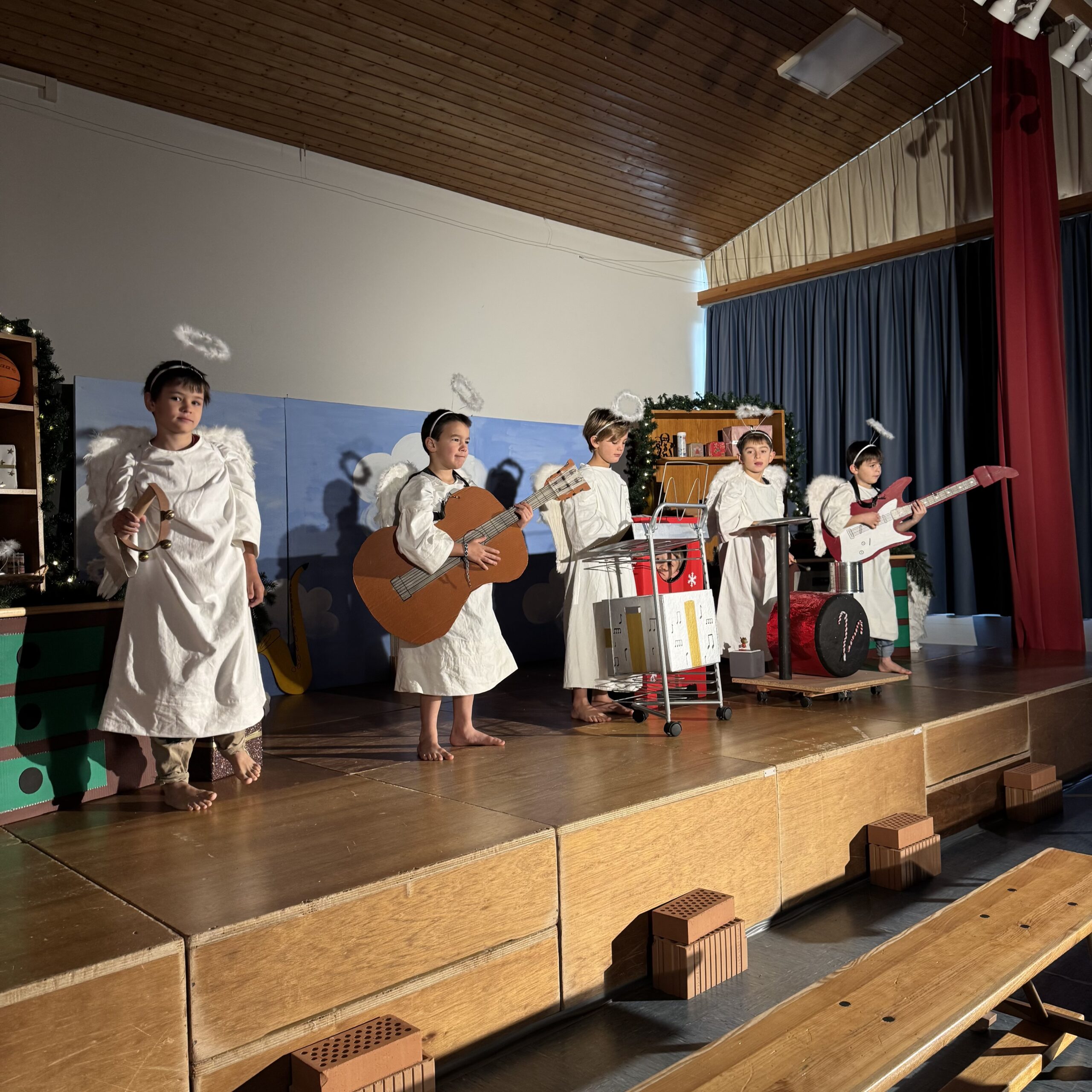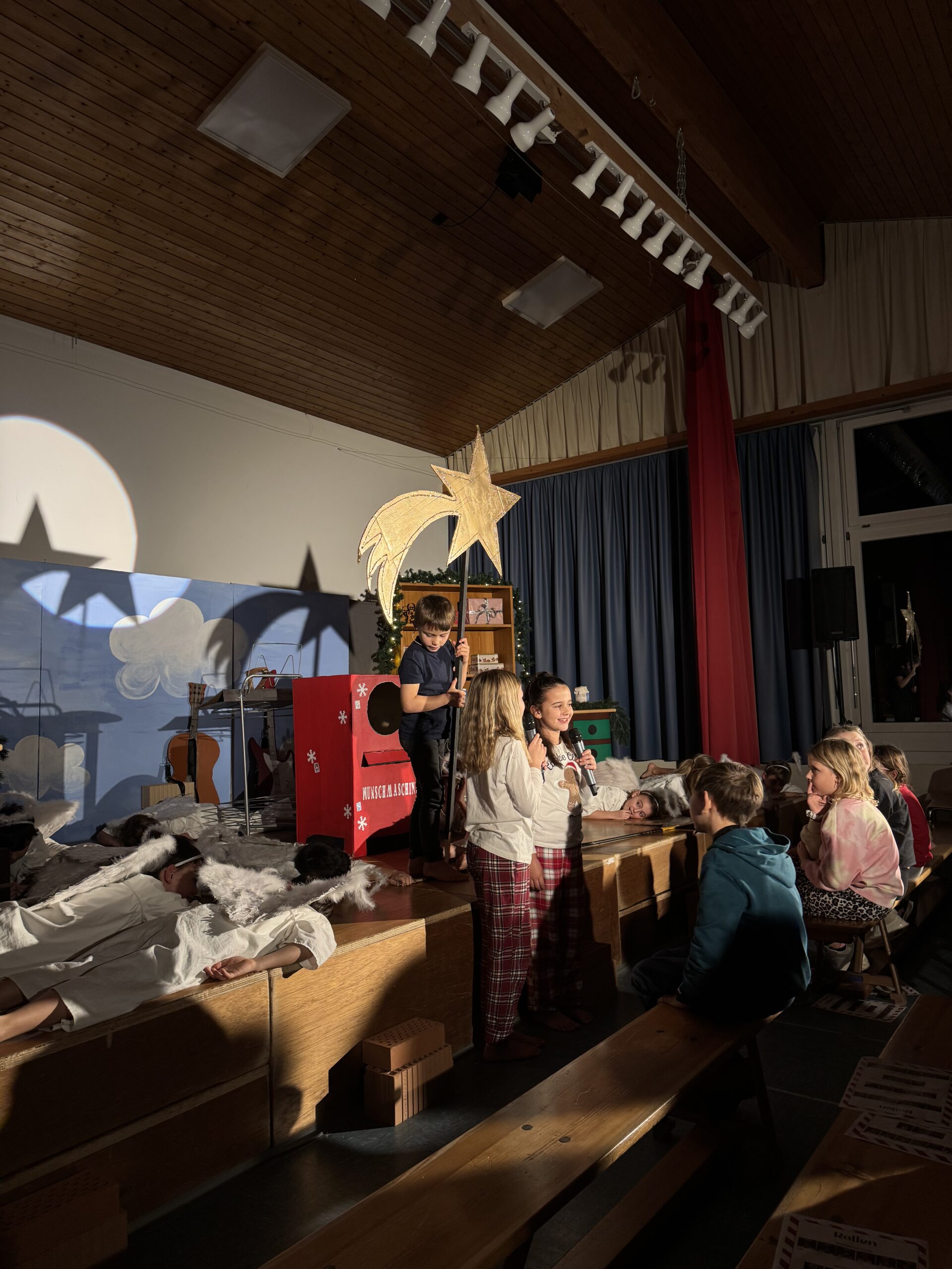 Wir fanden es großartig, dass die Geschichte so ein schönes Ende hatte. Wir waren begeistert, wie gut die Klasse die Lieder und Texte konnte. Jaron als Weihnachtsmann, Nina als kleiner Engel und Levin als Wunschmaschine waren großartig. Es war einfach Spitzenklasse!