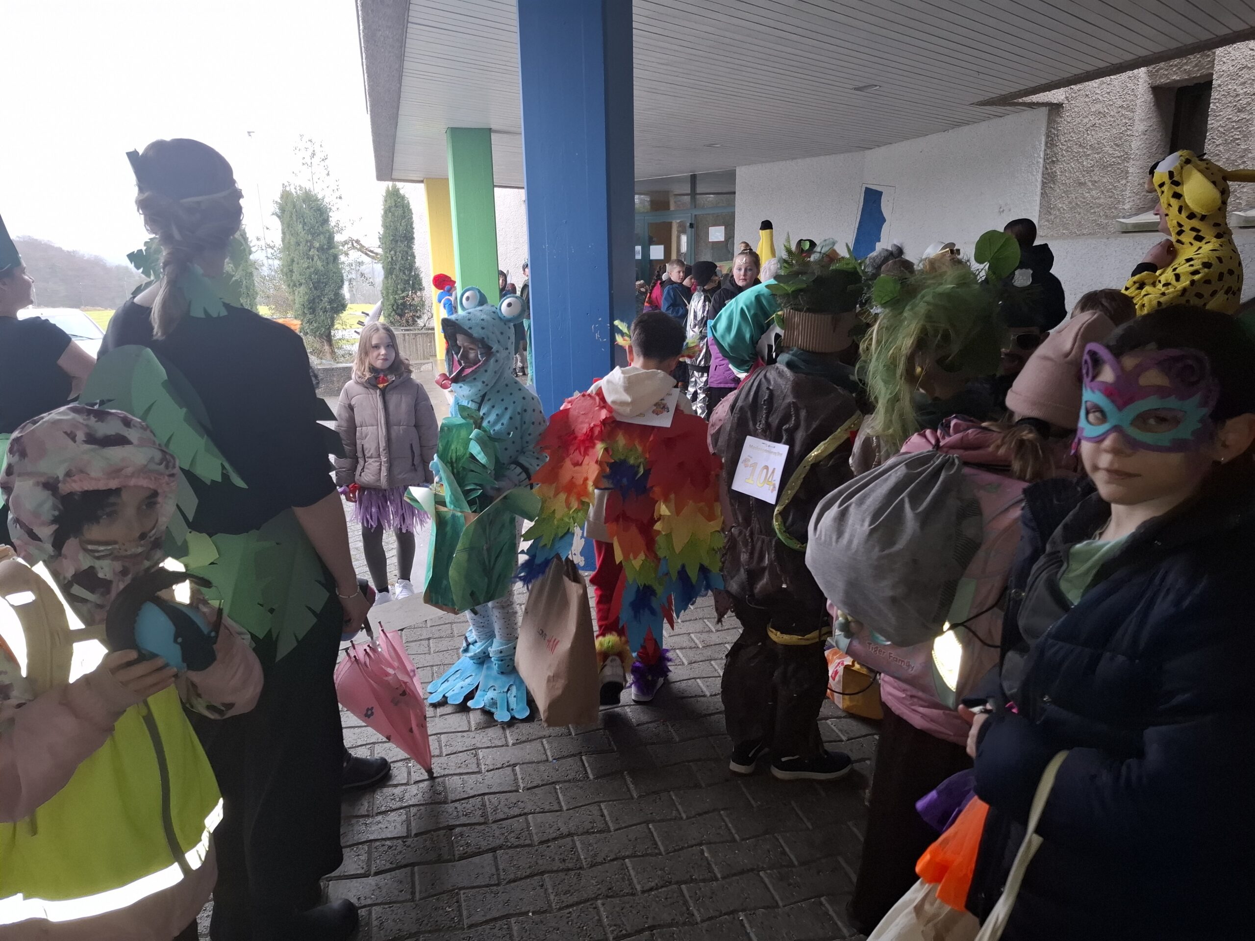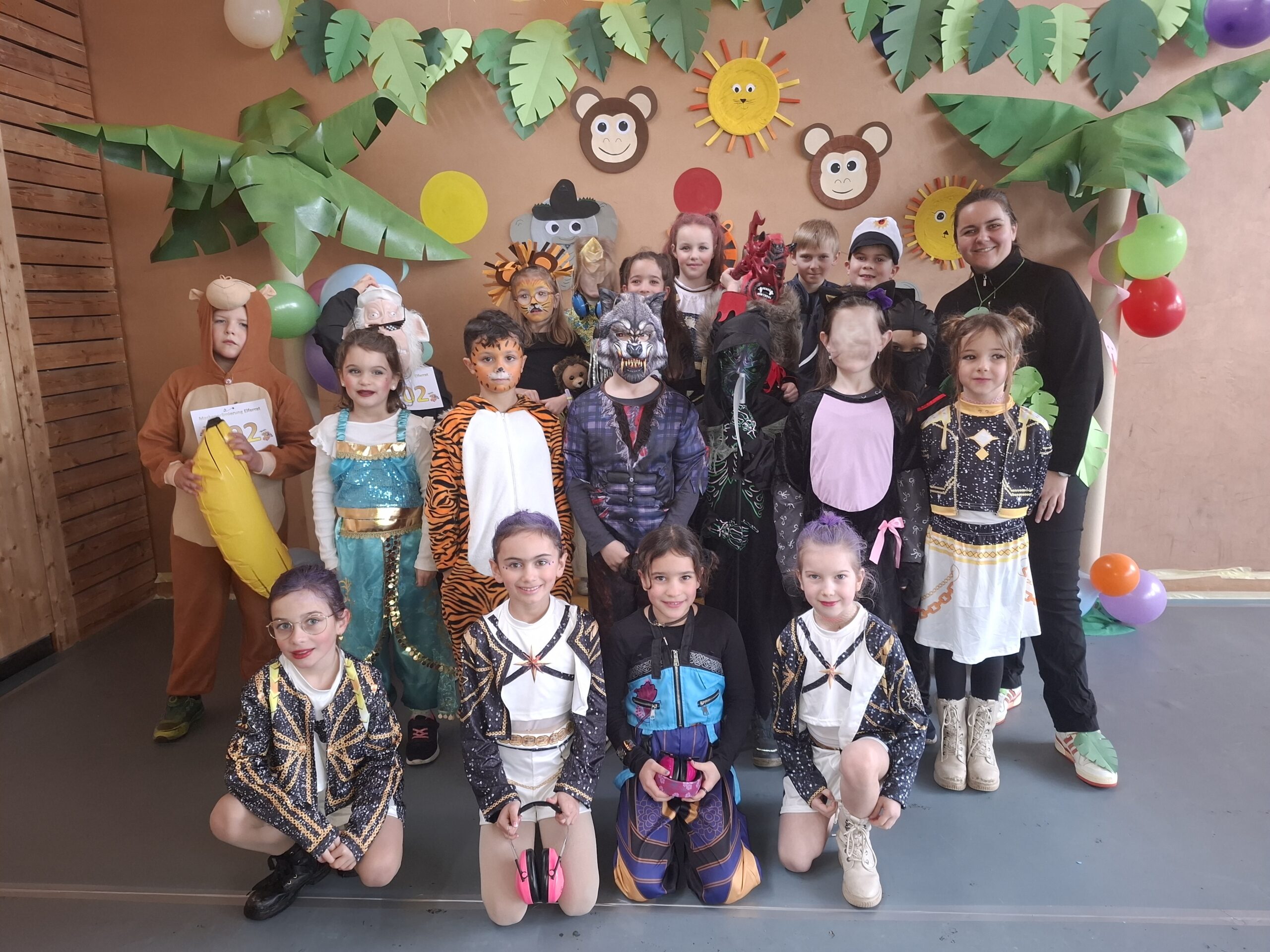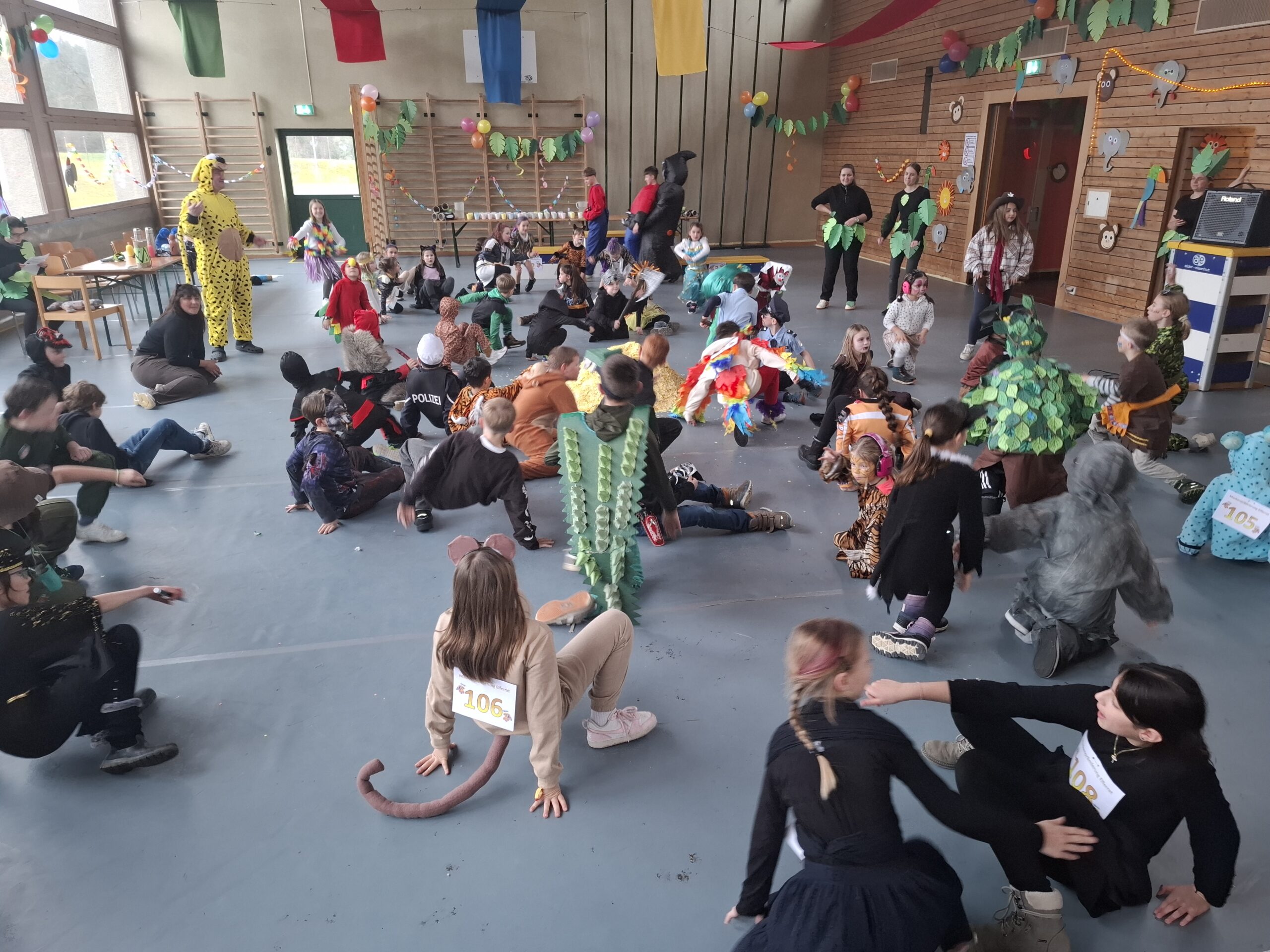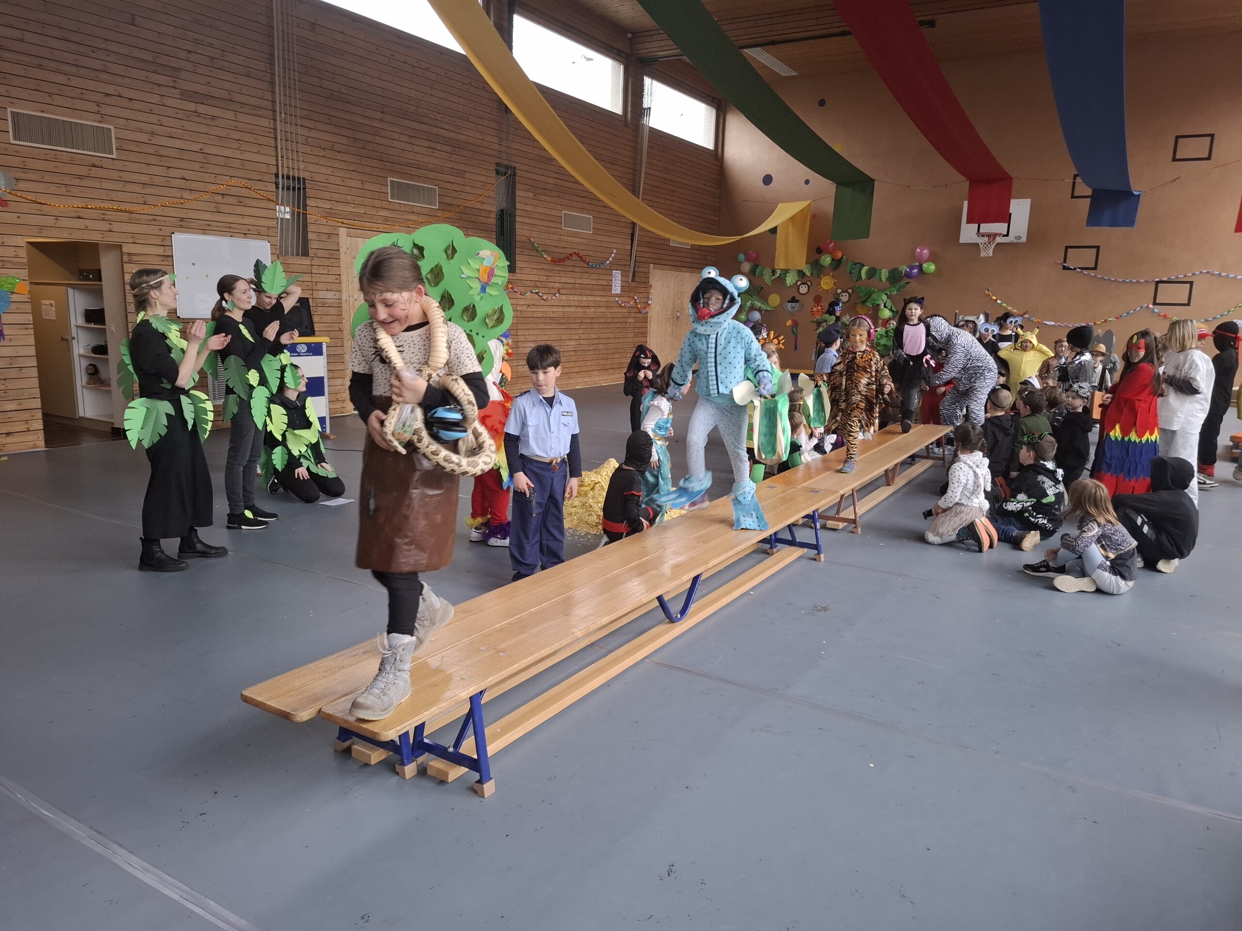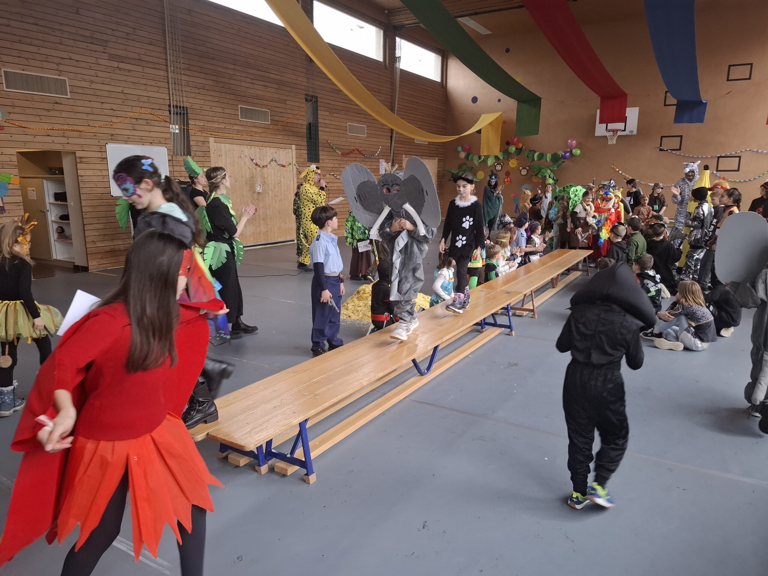 Pünktlich um 13.31 Uhr ging dann das bunte Treiben los. Klassenweise betraten wir die Turnhalle und machten als erstes ein Klassenfoto. Die Kostüme und Masken, welche extra für die Fasnacht gestaltet wurden, waren einfach grossartig. Nach einer kurzen Begrüssung legten wir mit Musik und Tanz los. Während die Kinder der 5. Klasse auf der Bühne vortanzten und alle Fasnächtlerinnen und Fasnächtler zum Mitmachen animierten, nutzen andere die Gelegenheit für ein Gruppenfoto oder sich in der Ruhezone zu erholen. Etwas später wurde der Laufsteg für die Präsentation der einzelnen Kostüme aufgebaut, auf dem sich die Kinder gruppenweise präsentierten.