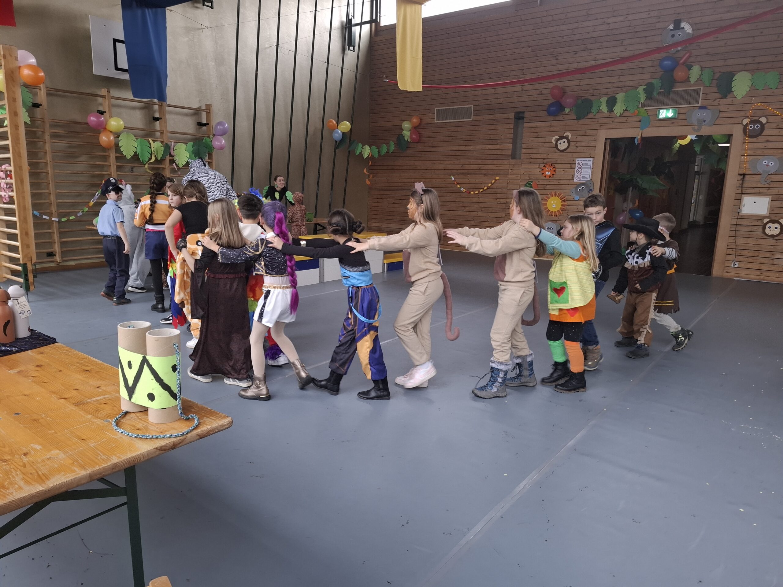 Am Schmutzigen Donnerstag richteten wir am Vormittag die Turnhalle für den Fasnachtsanlass ein. Wir legten den Boden, bliesen bunte Ballons auf und schmückten die Turnhalle mit der Dekoration, welche die ganze Schule für diesen Anlass gestaltet hatte.