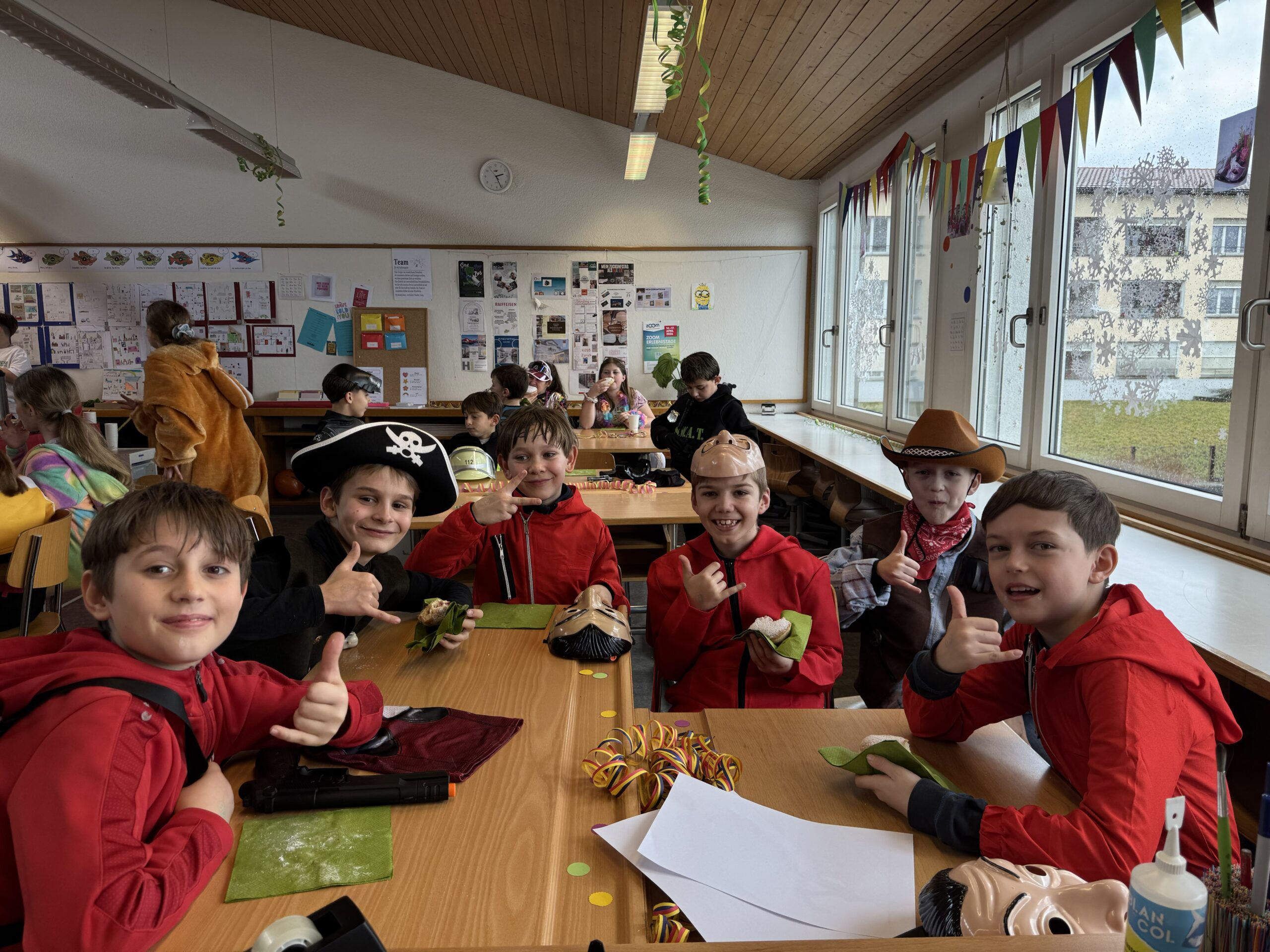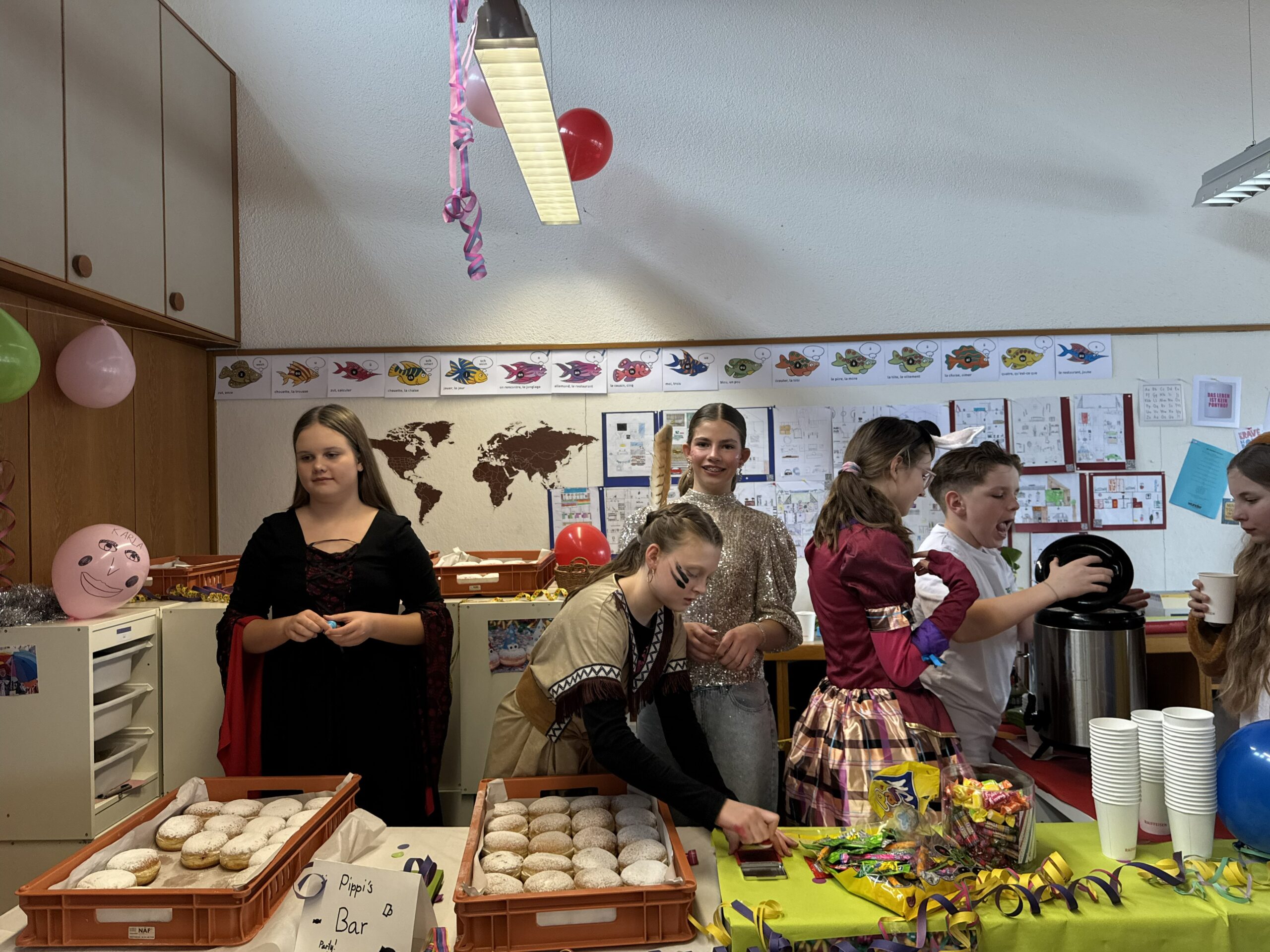 Die Lehrpersonen betreuten Pippis Stationen: Den Chaos-Parcour, das Kino, die kunterbunte Disco, den Fotostand und die Wurfspiele. In Pippis Restaurant unterstützte die 6. Klasse zusätzlich und versorgte die hungrigen Fasnächtler mit feinen Berlinern.
